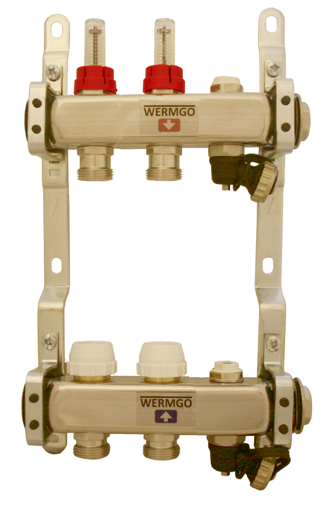 Rustfri gulvvarmefordeler utstyrt med flowmeter, konsoll, lufteventiler og påfyllingsventiler. Koplinger medfølger ikke.